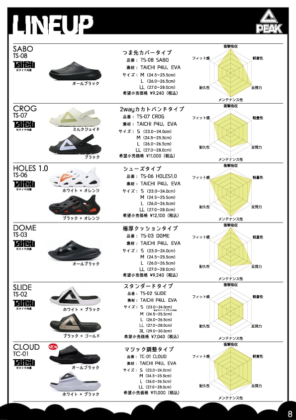 PEAKが開発した次世代クッション素材『TAICHI(タイチ)』を使ったサンダルです。リカバリーサンダルが持つ無反発性と、スポーツサンダルの持つ高反発性を合わせ持ち、状況によってその性質を変える新感覚素材です。